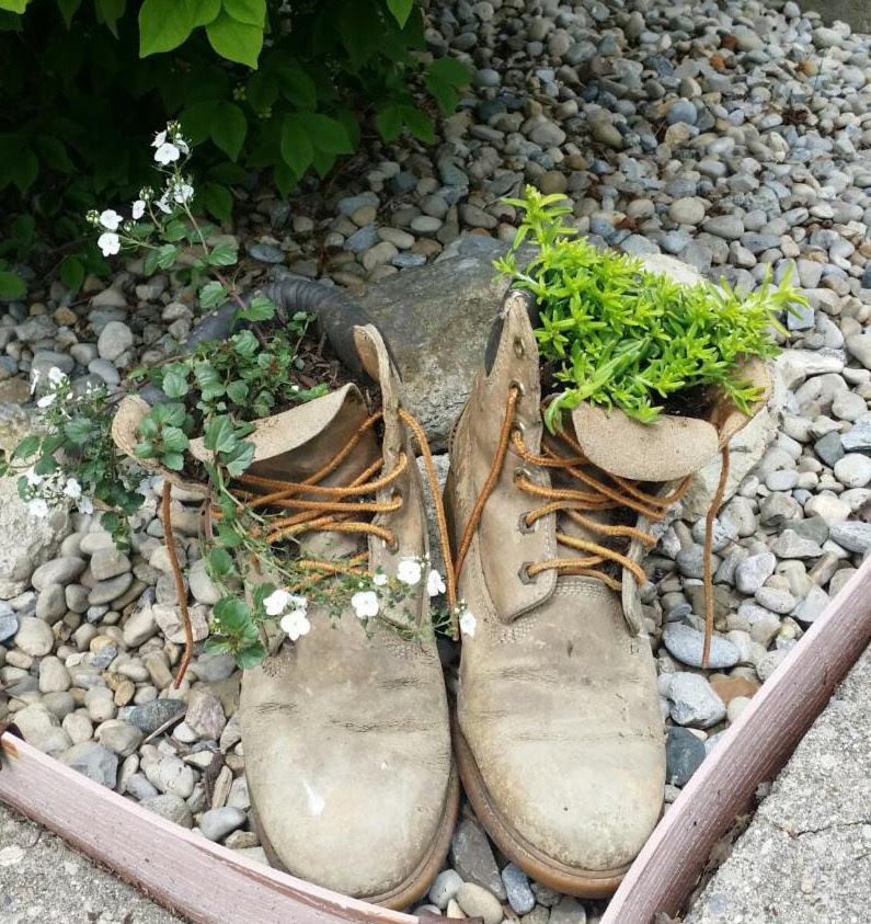 This is my original pair of hiking boots that I bought 30 years ago. I hiked many miles in them. When it came time to get a new pair, I decided to keep these and turn them into planters.That was 20 years ago. I have moved with them 3 times.  I have no idea why it took me so long to get around to actually buying plants for them. It just did. The gestation period on creative ideas can be a few minutes, days, months or years. Now, I realize that this idea is great fodder for those who want to keep everything because they might need it some day. But here’s a way that you can more easily decide if clutter can actually be released: Do you have a specific purpose in mind for it?  I knew from the very beginning that these boots would one day hold dirt and flowers. I didn’t hold on to them hoping I’d figure out something to do with them. And that’s the difference. As you look at a cluttered space and begin to go through what’s there, ask yourself: